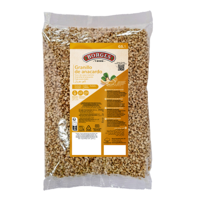Este granillo, elaborado a partir de anacardos de alta calidad, se presenta tostado y troceado, ofreciendo una textura crujiente y un sabor intensificado.